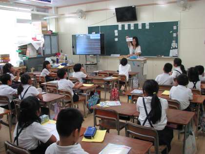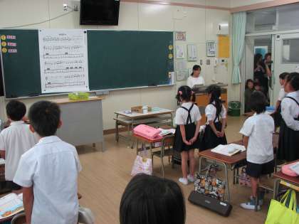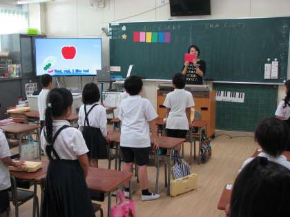 1年生では、音楽でリズムに合わせた合奏と英語の歌