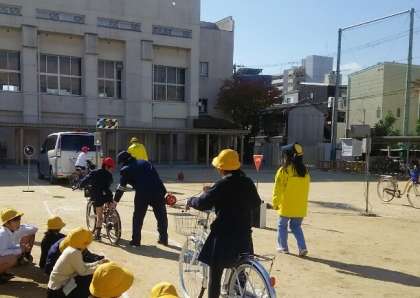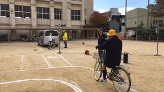 東成警察署の交通課の方と、市役所の安全パトロールのみなさんに来ていただいて、交通安全教室を行いました。