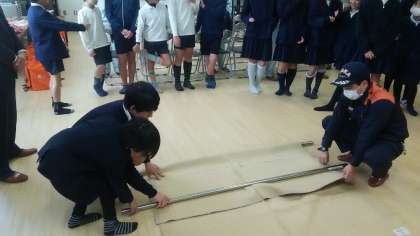 消火器の訓練と簡易担架づくりの訓練を行い、東成消防署の方から修了証を、町会長さんから認定証をいただきました。