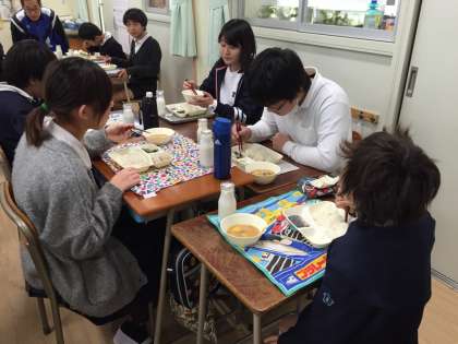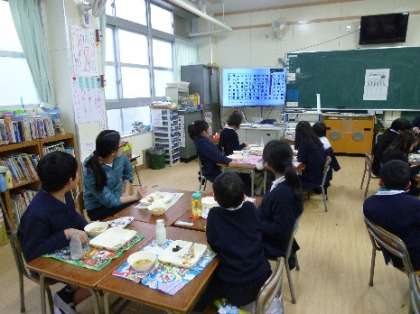 いつもと違う教室やメンバーで食べる給食に、最初は緊張していた児童も笑顔で楽しそうに給食を食べていました。