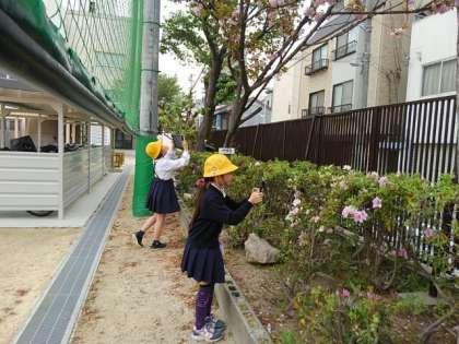 3年生は、理科で学校の中の春を見つける学習をしました。一人ずつタブレットで、見つけた春の植物を写真に撮りました。桜やチューリップの花が終わり、ツツジや野草に花が咲き始めた様子などをたくさん見つけて撮っていました。