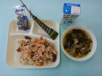 今日の給食は、こどもの日の行事献立です。牛肉のちらしずし、すまし汁、ちまき、牛乳のメニューです。