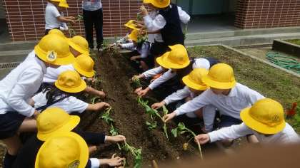 学習園のうねにさつまいもの苗をねかせて、やさしく土をかぶせました。