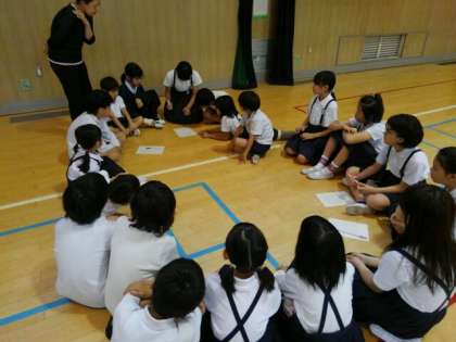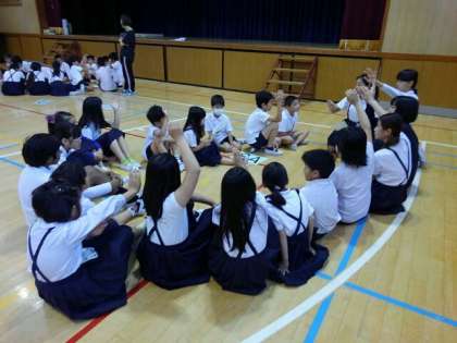朝の児童集会で、6月23日(土)の「今里子どもまつり」に向けた話し合いをしました。
