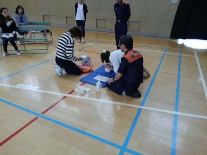 東成消防署の救急隊に来ていただき、意識・呼吸の確認から胸骨圧迫、人工呼吸法、AEDの使い方を学びました。