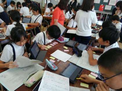 国語の「イースター島にはなぜ森林がないのか」で学習したことをもとに、環境問題について調べたことをタブレットでプレゼンテーションにまとめました。