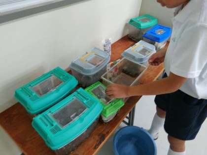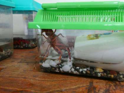 今朝は、ふたがしてある飼育箱から1匹のザリガニが脱走していて、みんなで大捜索!