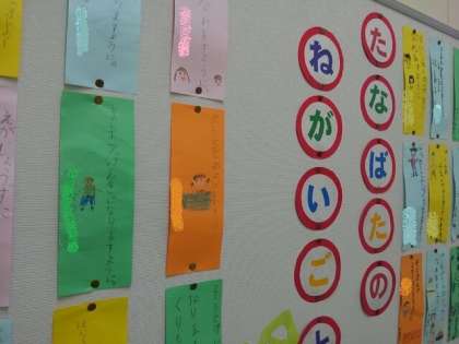 掲示板には、1年生・2年生が書いた、七夕のねがいごとが並んでいます。