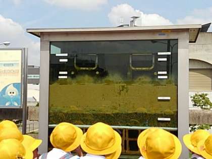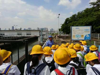 凝集貯水池から、ろ過池、配水池と広い浄水場を、暑い中説明を聞きながら歩いて回りました。