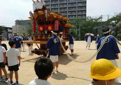 熊野神社の夏祭りのだんじりが、学校に立ち寄りました。