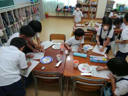 今日は、そのごちそうを使って、グループでパーティーをしたり、友だちの作品のいいところを見つけて、ワークシートに記入して伝え合ったりしました。