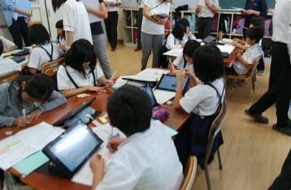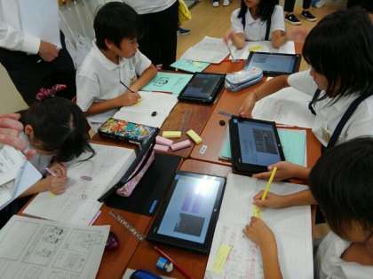 グループでお店に見学に行き、見つけたお店の工夫やひみつをタブレットにまとめています。