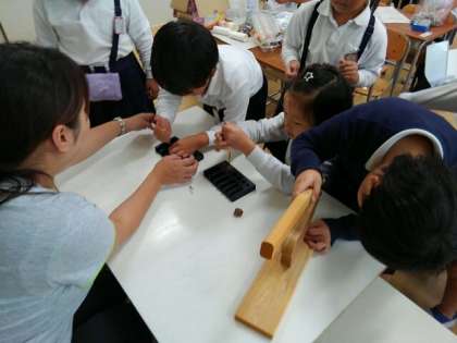 穴に糸を通してけん玉やネックレスを作ったり、ほかの材料と組み合わせて楽器やゲームを作ったり。