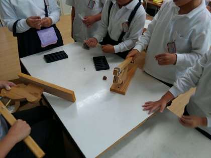 どんぐりの穴あけ機やきりで、どんぐりに穴をあけることができます。