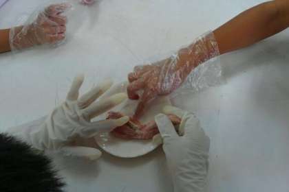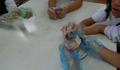 子どもたちはビニール手袋をはめて触ったり動かしたりして観察しました。