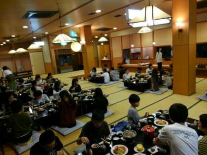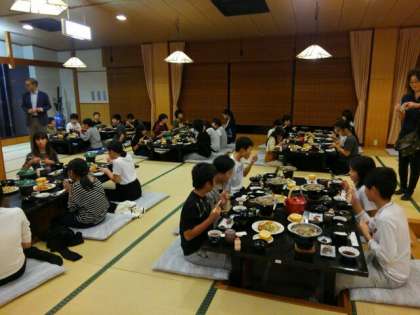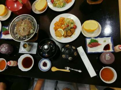 刺身、焼肉、チキン、茶碗蒸しとごちそうが並んでいます。