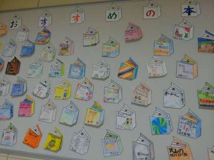 掲示板の「読書の木」には、子どもたち一人一人のおすすめの本が紹介されています。
