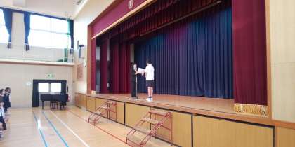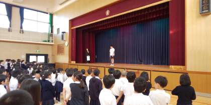 今朝の児童朝会で、中国語弁論大会に出場した児童が、みんなの前で発表しました。