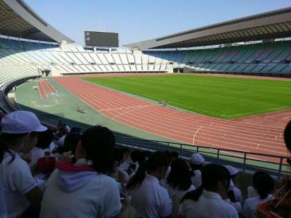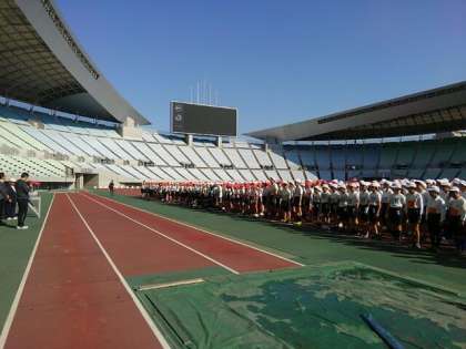 秋晴れの長居競技場に、東成区の6年生が集まり、スポーツ交歓会が行われています。