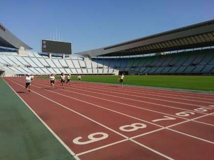 午前は競技場のコースで100メートル走に挑戦!他校の速さにびっくりするレースもありました。