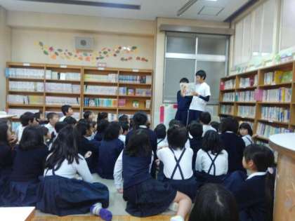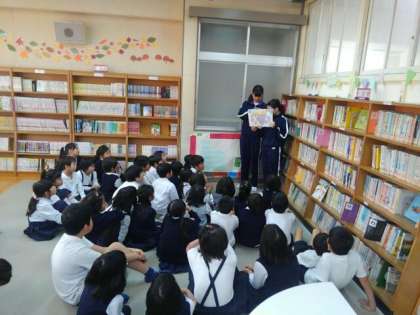 休み時間に図書室で、中学生が紙芝居をしてくれました。