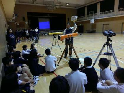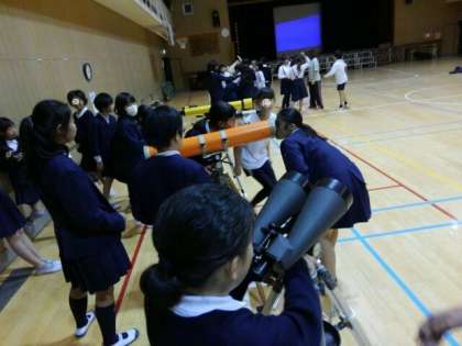 あいにく太陽が厚い雲にかくれていたために、室内で天体望遠鏡の仕組みや操作を教えていただきました。