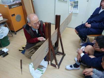 日本の伝統工芸である「大阪欄間(らんま)」職人の方々にきていただき、体験学習をしました。