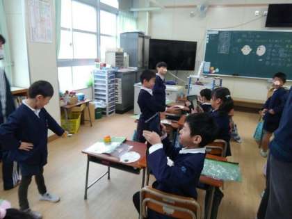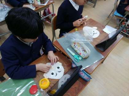 「怒っている顔だから、眉毛をつり上げようかな」「おどろいているところだから、口を大きく開けようかな」など、タブレット端末でとった写真を見ながら、顔のパーツの置き方を考え、いろんな表情を工夫して表していました。