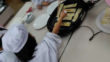 春巻きの皮に、砂糖と一緒に炒めたりんごとレーズンをのせて巻きました。その後、バターを塗ってホットプレートで焼いて出来上がり!