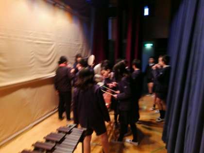 講堂の舞台幕の内側では、「見て見て集会」の練習が行われていました。