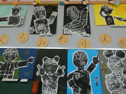 2年生の教室には、1月の参観授業で作っていた紙版画の作品が掲示されています。