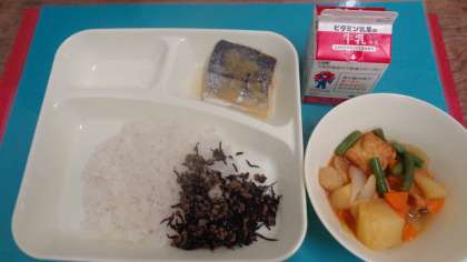 今日の給食は、「ごはん、牛乳、さごしのおろしじょうゆかけ、含め煮、牛ひじきそぼろ」でした。