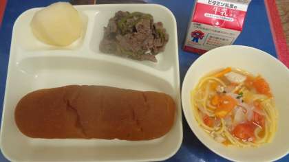 今日の給食は、「黒糖パン、牛乳、牛肉の香味焼き、トマトのスープスパゲッティ、なし」でした。