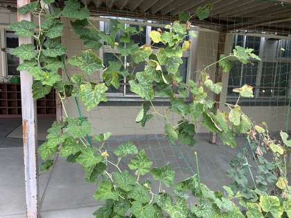 つるがネットにくるりと巻きつくと、「つかまった!」と歓声があがり、成長の様子を間近で楽しんでいます。