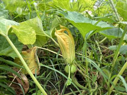 「勝間南瓜(こつまなんきん)」の花から、ついに小さな実ができ始めました!