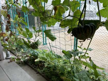 ネットにぐんぐんとつるを伸ばしている「勝間南瓜(こつまなんきん)」の実が、大きくふくらんできました。