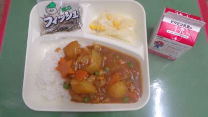 今日の給食は、「チキンカレーライス、牛乳、キャベツとコーンのサラダ、ミニフィッシュ」でした。