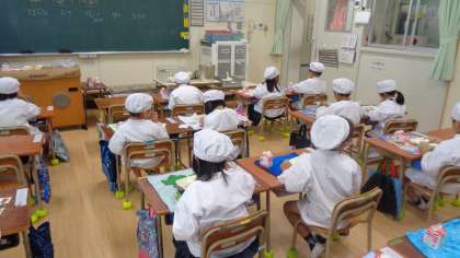 チキンカレーは、鶏肉、にんにく、玉ねぎをじっくり炒め、その他の野菜を加えて炒め、煮込んだ後、カレールウを加え、さらに15分以上かき混ぜながらじっくりを煮こんで仕上げています。調理員さんたちの愛情たっぷりカレーは、本当に美味しかったです。