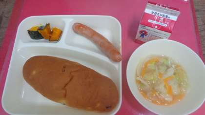 今日の給食は、「おさつパン、牛乳、ウインナーのケチャップソース、スープ、焼きかぼちゃ」でした。