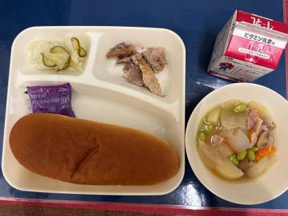 今日の給食は、「コッペパン、ブルーベリージャム、牛乳、鶏肉のバジル焼き、ベーコンと野菜のスープ煮、キャベツときゅうりのサラダ」でした。