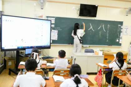 書写の時間に水筆を使って、とめ・はらい・交わりを練習しています。