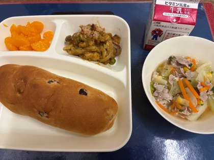 今日の給食は、「レーズンパン、牛乳、カレーマカロニグラタン、豚肉と野菜のスープ、みかん(缶)」でした。