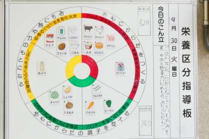 給食の献立に使われている食材をすべて3色栄養に分類して掲示します。