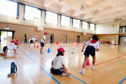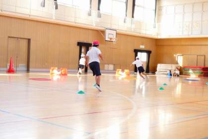 運動会に向けて、ジグザグやコーンを回ったりする走り方をやっています。