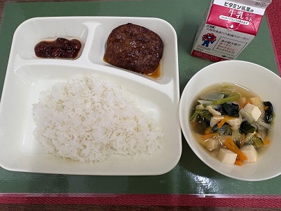 今日の給食は、「ごはん、牛乳、和風ハンバーグ、五目汁、金時豆の煮もの」でした。