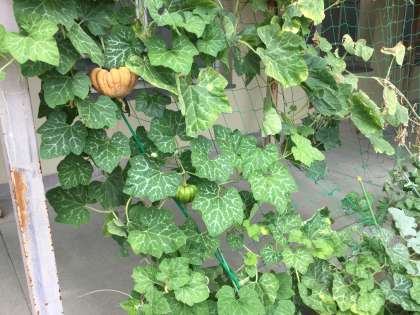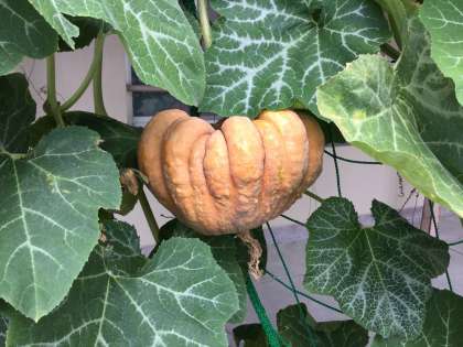 「勝間南瓜(こつまなんきん)」が、これまでの濃い緑色から赤茶色へと色づきました。
