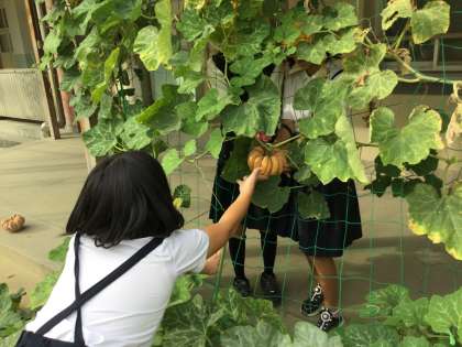 子どもたちは「色が変わった!」と驚きながら、育ててきた南瓜の成長を嬉しそうに見つめています。