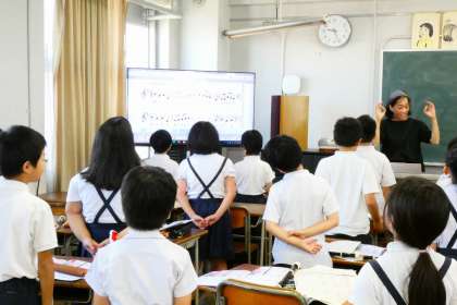 大型モニターに映し出された楽譜を見て斉唱します。 良い姿勢で、すてきな声で歌っています。