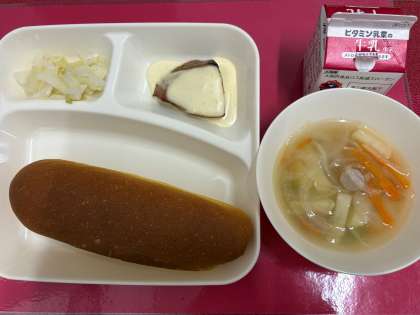 今日の給食は、「パンプキンパン、牛乳、かつおのガーリックソースかけ、ウインナーとじゃがいものスープ、キャベツのサラダ」でした。