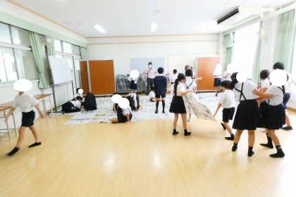 新聞紙で面積が1平方メートルの正方形をつくり、多目的室の広さはかってみようという課題に取り組みました。